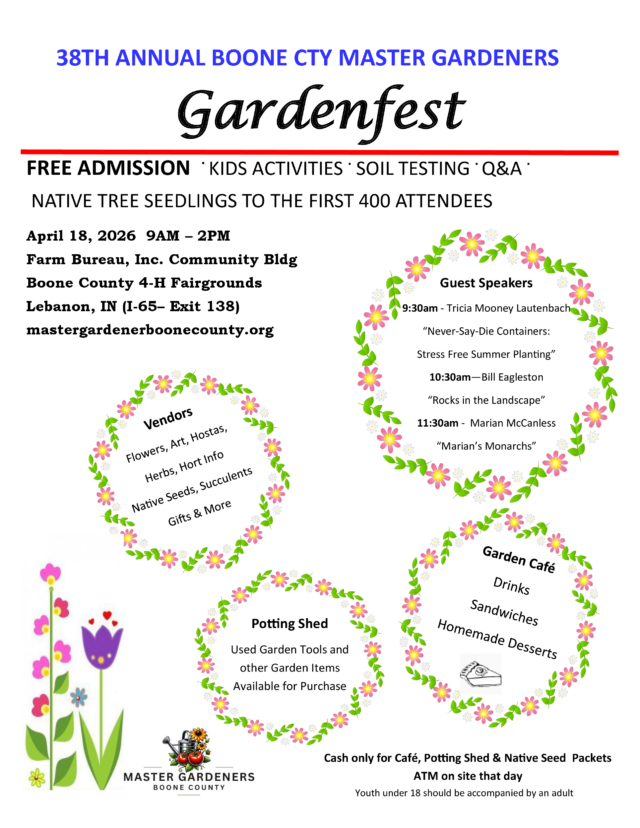 Gardenfest is the annual garden extravaganza hosted by the volunteer Boone County Master Gardeners (BCMG). It’s a popular event with over 800 people attending at the Farm Bureau Community Building at the Boone County Fairgrounds. Each year the first 400 attendees will receive a free native tree seedling. The Master Gardeners have several tables offering soil testing, native seed packets, information about invasives, rain gardens, ask a Master Gardener gardening questions, community gardens and how to become a Master Gardener. In addition there is the Pansy Patch with kids’ activities and the Potting Shed selling gently used garden items. Over twenty vendors also participate.